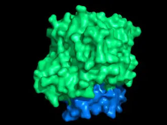 Structurally, DHOQOs are organized in monomers which adopt a (βα)8 (eightfold beta alpha barrel) fold.[9] The enzyme can be separated in its N-terminal domain (blue in the figure) and in its C-terminal domain (green in the figure).
