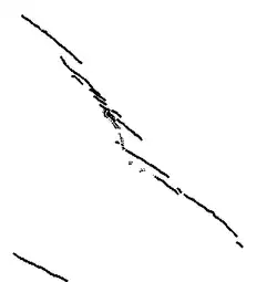 It is common for a set of dikes, each a few kilometers long, to form en echelon. This pattern is seen in the Higganum dike set of New England. This dike set consists of individual dikes that are typically four kilometers in length at the surface and up to 60 meters wide. These short segments form longer groups extending for around 10 km. The entire set of dikes forms a line extending for 250 km. Individual segments overlap, with the overlapping portions thinner, so that the combined thickness of the two overlapped portions is about the same as the thickness of a single segment. Other examples of en echelon dikes are the Inyo dike of Long Valley, California, US;[11] the Jagged Rocks complex, Arizona, US;[8] and the dikes of oceanic spreading centers.[11]