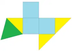 There are three special case geometries of the diminished trigonal trapezohedron. The simplest is a diminished cube. The Chestahedron, named after artist Frank Chester, is constructed with equilateral triangles around the base, and the geometry adjusted so the kite faces have the same area as the equilateral triangles.[1][2] The last can be seen by augmenting a regular tetrahedron and an octahedron, leaving 10 equilateral triangle faces, and then merging 3 sets of coparallel equilateral triangular faces into 3 (60 degree) rhombic faces. It can also be seen as a tetrahedron with 3 of 4 of its vertices rectified. The three rhombic faces fold out flat to form half of a hexagram.