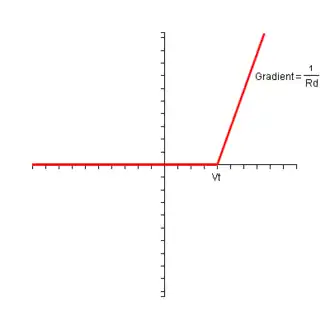 If the anode of the diode is connected to 0 V, the voltage at the cathode will be at Vt and so the potential at the cathode will be greater than the potential at the anode and the diode will be reverse biased. In order to get the diode to conduct, the voltage at the anode will need to be taken to Vt. This circuit approximates the cut-in voltage present in real diodes. The combined I-V characteristic of this circuit is shown below: