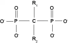 Bisphosphonates mimic the endogenous inorganic pyrophosphate where the oxygen backbone is replaced with carbon (P-C-P for P-O-P). The two additional groups or side chains on the carbon backbone are usually referred to as R1 and R2. R1 is usually a hydroxyl group which enhances the affinity for the calcium by forming a tridentate ligand along with the phosphate groups. The compound can be made more potent by optimizing the structure of the R2 group to best inhibit bone resorption.[13]
