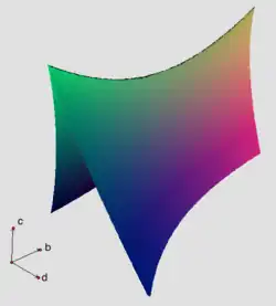 The discriminant of the quartic polynomial x4 + cx2 + dx + e. The surface represents points (c, d, e) where the polynomial has a repeated root. The cuspidal edge corresponds to the polynomials with a triple root, and the self-intersection corresponds to the polynomials with two different repeated roots.