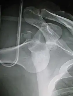A shoulder dislocation often occurs as a result of a fall onto an outstretched arm or onto the shoulder.[3] Diagnosis is typically based on symptoms and confirmed by X-rays.[2] They are classified as anterior, posterior, inferior, and superior with most being anterior.[2][1]