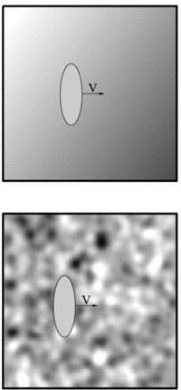(a) The Brownian particle in the Caldeira-Leggett model experiences a fluctuating homogeneous field of force. (b) In case of the DLD model the fluctuating field is farther characterized by a finite correlation distance. The background image is a "snapshot" of the fluctuating environment. Namely, the gray levels correspond to the "height" of an instantaneous potential which is experienced by the Brownian particle.