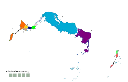 By the time of the 2016 House of Assembly elections, there were 10 electoral districts ("constituencies") and the results were as follows: