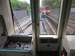 View from the front of a Docklands Light Railway train. The control panel is usually closed and locked.