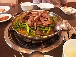 During the Joseon period (1392–1897), there is evidence that dog meat was seen as somewhat of a delicacy, although it was still not widely consumed. Some people reserved its consumption for special days, including hot days in the summer, funerals, and hwangap celebrations (sixtieth birthday celebrations historically considered important).[10] Around 1816, a son of prominent scholar Jeong Yak-yong wrote a poem called Nonggawŏllyŏngga (농가월령가) that described seasonal practices of rural populations. He described a woman serving boiled dog meat, among other foods, to the parents of her husband.[16][17] The 1849 book Dongguksesigi contains a recipe for the dog meat dish bosintang.[18]