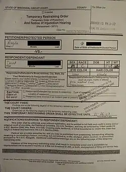 - ^ "Process for Obtaining a Restraining Order in Wisconsin" (PDF). WCADV. Wisconsin Coalition Against Domestic Violence. Archived from the original (PDF) on 10 March 2016. Retrieved 12 January 2014.