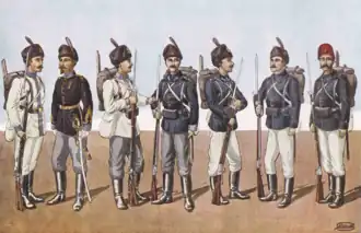 After 1891, the infantry troops wore the same uniform. From 1912, the same type of uniform was introduced for the whole army. Initially of grey-green color, these were changed to khaki after the First World War.[8][11]