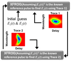 A unique DB FROG retrieval algorithm, based on the XFROG algorithm, is used to retrieve the two unknown pulses by making use of the two recorded traces. The retrieval algorithm divides the whole retrieval problem into two XFROG problems. It starts with random initial guesses for both unknown pulses and takes one of the unknown two pulses, say, as the unknown and as the gate. Even though is not the correct gate pulse to begin with, the algorithm treats it as if it is the correct one. The standard XFROG algorithm along with trace 1 is used to retrieve . The returned is not the correct one, but it is an improved version of it, since trace 1 contains information about . This improved version of is then used in the next step of the retrieval algorithm, which now reverses the roles of and ( as known and as the unknown) and runs trace 2 with standard XFROG algorithm to produce a better version of . This completes one cycle of the retrieval algorithm and improves both and . The retrieval algorithm then uses the improved results for and to perform the next cycle. It continues alternating between traces 1 and 2 until the desired agreement between measured and retrieved traces occurs. It typically takes 3-5 cycles to converge depending on the complexity of the pulse pair. Also, complete convergence on early iterations is not necessary.
