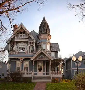 The Dr. J.O. and Catherine Ball House is a historic building located in Mount Pleasant, Iowa, United States. In 1892 this was one of three houses designed by George F. Barber's mail-order architectural firm that was being built in town, and it was the most elaborate of the three.[2] The house is an enlargement of Barber's more expensive plans for design no. 33 from his 1891 book. The 2½-story frame Queen Anne features an irregular plan, a brick-faced limestone foundation, and an octagonal tower with an ogee shaped roof. The circular window on the second story projection is framed with three balconies, one above and one on either side. The wrap-around porch has a projecting gable roof supported by turned columns. A two-story bay window is located on the east elevation. It was also the first house in Mount Pleasant that was totally reliant on electricity for lighting.[2] It was built for Dr. J.O. Ball, a dentist, who was active in civic improvements in Mount Pleasant. The house was listed on the National Register of Historic Places in 1986.[1]
