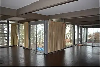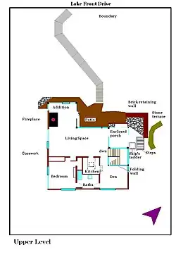The configuration is a small rectangular, two-story box with a flat roof. An early addition was created on the northwest corner of the house. Materials chosen for the construction of the home are contextual with the landscape. The house's lower level walls are composed of dark brown colored bricks.[2]