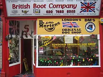 Dr. Martens, also known as Doc Martens, Docs, or DMs,[2] is a British footwear and clothing brand. Although most known for its footwear, it also makes a range of accessories, including clothing and bags. The footwear is distinguished by its air-cushioned sole, upper shape, welted construction, and yellow stitching. The company's global head office and design studio is located in Camden Town, London.[3]