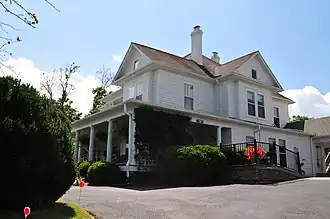 Dr. Virgil Cox House is a historic home located at Galax, Virginia, owned by Virgil J. Cox. It was built about 1913, and is a large 2+1⁄2-story frame dwelling with Queen Anne and Colonial Revival style design elements. It has a complex exterior presentation, complex roof plan, and an equally complex floor plan. The house is sheathed in German siding and features irregular, front-gable projections on the facade and north side; a projection with a polygonal bay on the southwest corner, a gable-roof dormer on the facade; and a small, upper balcony on the facade with attenuated Tuscan columns and pilasters. Also on the property are a contributing boxwood garden and outbuilding.[3]