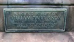 Ryefield House was described as "almost new" in 1851[5] and the estate possessed a fine 'U-shaped' stable block with a courtyard to the east of the mansion house as well as a large walled garden to the west. The mansion house is of a classical style, built of ashlar with a Doric porch and in the 1920s a single storey ballroom was added,[5] also used as an art gallery by William Barr Knox. William first married Gladys Burrell, a niece of Sir William Burrell the Scottish shipping merchant and philanthropist, made famous through the Burrell Collection. Edith Dunlop of Strathaven was the second wife of William Barr Knox, he is buried in Largs, however a commemorative plaque is also present at the Knox family memorial in Kilbirne 'Auld Kirk' cemetery where he is recorded as being of 'Redheugh and Ryefield'. His daughter was named Diana.