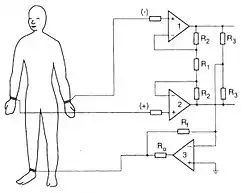 A driven right leg circuit (DRL circuit; also known as the right leg driving technique) is an electric circuit that is often added to biological signal amplifiers to reduce common-mode interference. Biological signal amplifiers such as ECG (electrocardiogram), EEG (electroencephalogram), or EMG circuits measure very small electrical signals emitted by the body, often as small as several micro-volts (millionths of a volt). However, the patient's body can also act as an antenna which picks up electromagnetic interference, especially 50/60 Hz noise from electrical power lines. This interference can obscure the biological signals, making them very hard to measure. Right leg driver circuitry is used to eliminate interference noise by actively cancelling the interference.