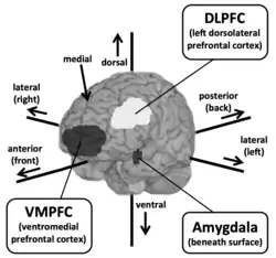 Greene[21] and his colleagues carried out fMRI experiments in order to investigate which regions of the brain were activated in subjects while responding to 'personal dilemmas' such as the footbridge dilemma and 'impersonal dilemmas' such as the switch dilemma. 'Personal dilemmas' were defined as any satisfying three conditions: a) The action in question could reasonably be expected to lead to bodily harm, b) The harm is inflicted in particular persons or members of a particular group and c) The harm is not a result of diverting a previously existing threat onto another party. All other dilemmas were classed as 'impersonal'. It was observed that when responding to personal dilemmas, the subjects displayed increased activity in regions of the brain associated with emotion (the medial Prefrontal cortex, the posterior Cingulate cortex/Precuneus, the posterior Superior temporal sulcus/Inferior parietal lobule and the Amygdala), while when they responded to impersonal dilemmas, they displayed increased activity in regions of the brain associated with working memory (the Dorsolateral prefrontal cortex and the Parietal lobe). In recent work, Greene has stated that the Amygdala is primarily responsible for the emotional response, whilst the Ventromedial prefrontal cortex is responsible for weighing up the consequentialist response against the emotional response. Thus, three brain regions are primarily implicated in the making of moral judgements.[20] This gives way to what Greene[6] calls the Central Tension Principle: "Characteristically deontological judgements are preferentially supported by automatic emotional responses, while characteristically consequentialist judgments are preferentially supported by conscious reasoning and allied processes of cognitive control".