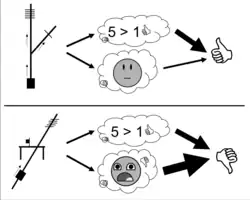A diagram depicting how Greene supposes the affective (automatic) response would override the consequentialist (manual) response in the footbridge case (below), but not in the switch case (above).[20]