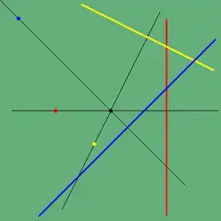 In order to turn this process into a correlation, the Euclidean plane (which is not a projective plane) needs to be expanded to the extended euclidean plane by adding a line at infinity and points at infinity which lie on this line. In this expanded plane, we define the polar of the point O to be the line at infinity (and O is the pole of the line at infinity), and the poles of the lines through O are the points of infinity where, if a line has slope s (≠ 0) its pole is the infinite point associated to the parallel class of lines with slope −1/s. The pole of the x-axis is the point of infinity of the vertical lines and the pole of the y-axis is the point of infinity of the horizontal lines.