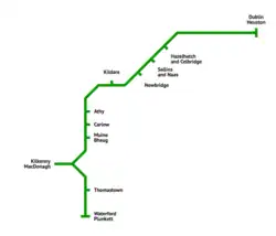 The Dublin-Waterford line is a railway line in Ireland connecting Dublin with the major port of Waterford City in County Waterford. The line is part of the significant network of InterCity routes connected to the Dublin-Cork Main Line from Dublin Heuston. The line was constructed by the Great Southern and Western Railway. At Cherryville Junction, County Kildare the line splits from the Cork line.[1] Both passenger and freight services run on the line. InterCity passenger services are operated by the 22000 Class DMUs. Kilkenny is located on a short spur off the line; freight trains use the Lavistown loop line to avoid reversal there.[2]