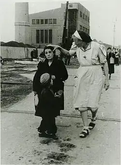 On 18 September 1944, a two-person delegation from the International Red Cross, led by Dr. Paul Wyss (a Swiss citizen), arrived at the camp. The Germans then improvised a comfortable transport for the refugees.[64] Passenger cars were waiting on the platforms, some halls were cleaned up (with part of the population removed in advance), and the prisoners were given better meals. Dr. Jadwiga Oszkielowa, who despite threats from the Germans presented the Red Cross delegates with the true situation of the refugees, was punished by having her access card to the camp revoked. She was also threatened with arrest.[66] After the departure of the Red Cross representatives, the situation in the camp returned to its previous state.[67]