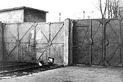 The area of the Pruszków camp was 48 hectares. Its infrastructure consisted of nine large production halls and several smaller buildings.[1] The camp was surrounded by a concrete wall with four gates.[12] The German staff were quartered in the "Palace" office building and the former railway school building. The production halls served the following functions: