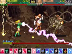 Shadow over Mystara also introduced a selection of special moves which are executed by moving the joystick and tapping the buttons in certain combinations, in a way similar to the Street Fighter series. The characters (except for the Magic-User) have a Dashing Attack as well as a Rising Attack which can be used to combo monsters or even juggle them in the air. Most characters (again, with the exception of the Magic-User and also Cleric) also have a Megacrush, a move common to nearly all of Capcom side-scrollers, which damages all enemies standing close enough to the character but in turn also damaging the player themselves.