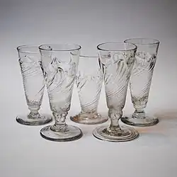 Owing to the large time period in which they were produced, dwarf ale glasses are varied in their appearance. A common form is the wrythen (twisted) dwarf ale glass, which is encountered with tight or wide wrythening on the bowl. In addition, the wrythen-moulding can extend from the bowl to the stem of the glass or be limited to half of the bowl. A rare type is the flammiform (flame-like gadrooning) dwarf ale glass, which was popular at the turn of the 18th century. Other forms are frequently found engraved with hop cone and barley ear motifs.[2][5] Early glasses are often adorned with a conical folded foot, but this is not necessarily a prerequisite of age.[2] Moreover, some 19th century glasses possess a folded foot.[6]