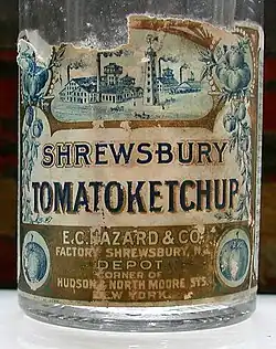 Among the consumer goods produced by E. C. Hazard and Company at its Shrewsbury, NJ facilities were Hazard's Shrewsbury Brand "Tomatoketchup" (one word), canned tomatoes (which the firm sometimes called by the archaic name "Love Apples"), canned baked beans and mushrooms, as well as white asparagus, okra, peppers, tarragon, jellies, salad dressings, and various sauces.[3] The earliest well-known product it distributed, however, was made by another manufacturer: McIlhenny Company's Tabasco brand pepper sauce, which Hazard and Company helped to introduce nationally beginning in the early 1870s.[5]
