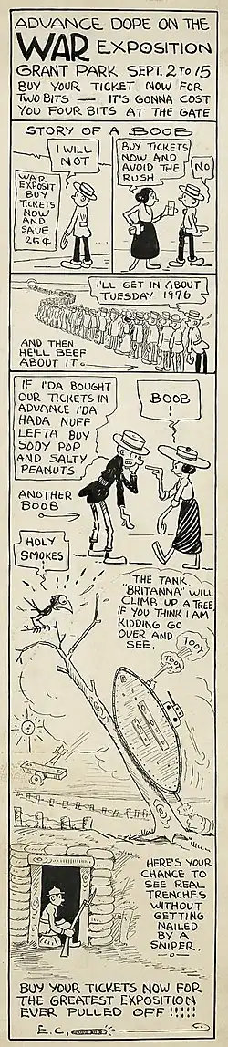 Segar moved to Chicago, Illinois, where he met Richard F. Outcault, the creator of The Yellow Kid and Buster Brown. Outcault encouraged him and introduced him at the Chicago Herald.[2] On March 12, 1916, the Herald published Segar's first comic, Charlie Chaplin's Comic Capers, which ran for a little over a year. In 1917, Segar created Barry the Boob, about an incompetent soldier. Segar also originated two other, short-lived comics for the Herald's Sunday magazine. These were The Mistakes of Mr. Muddle and the Rube Goldberg-inspired And They Get By With It.[3] In 1918, he moved on to William Randolph Hearst's Chicago Evening American, for which he created Looping the Loop and worked as a second-string drama critic.[7][11] Looping the Loop was a comic strip that gave a whimsical take on the events in Chicago's "Loop" district. "Looping the Loop" made jokes about such issues as silent movies, plays, and the changing seasons; it proved popular with the Herald's readers.[7] Segar married Myrtle Johnson that year; they had two children. In October 1919, Segar covered that year's World Series, creating eight cartoons for the sports pages.[12][13]