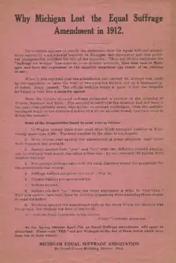 In addition to supporting non-violent dispute resolution, Warriner also supported the enfranchisement of women prior to the enactment of the 19th Amendment.[15] He was a member of the Michigan Equal Suffrage Association and a President of its local chapter. Women's suffrage appeared as a Michigan referendum in 1912. It failed, and in 1913 the Michigan Equal Suffrage Association claimed that the failure was due to election fraud. In a speech delivered in 1914, Warriner stated "I am fully persuaded in my own mind of the justice of the demand of the women for a right to vote."