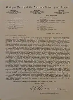 Letter from E. C. Warriner, President of the Michigan Branch of the American School Peace League, urging its members to celebrate Peace Day as a means of educating students about non-violent dispute resolution through the newly established Permanent Court of Arbitration (in The Hague, Netherlands)