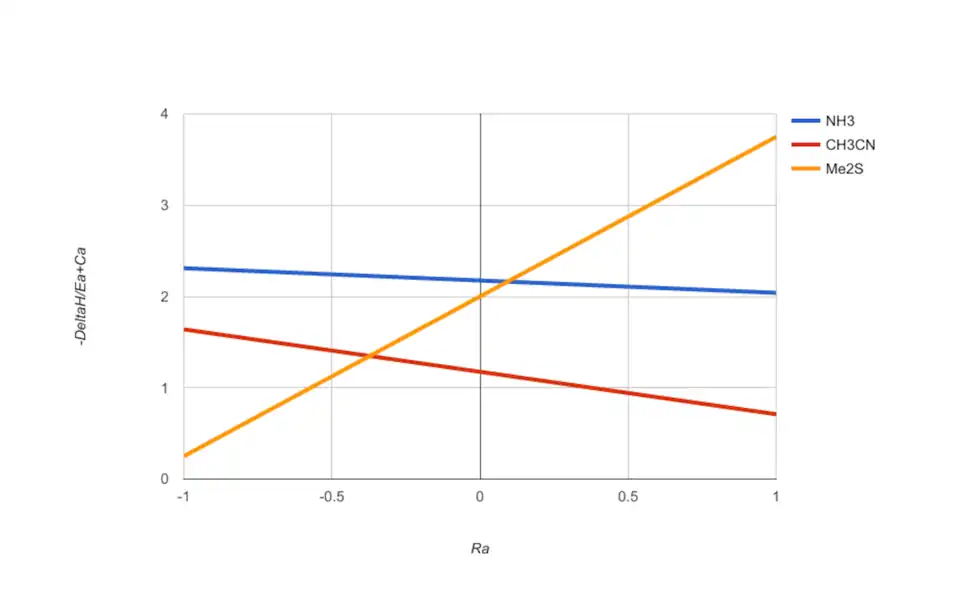 In a Cramer–Bopp plot for Lewis bases, the parameter Ra[a] reflects the mode of bonding of a potential Lewis acid partner, from purely electrostatic interactions (Ra = −1) to purely covalent interactions (Ra = +1). The parameter reflects the strength of the bonding interaction. The plot shown here allows comparison of three chosen Lewis bases: acetonitrile, ammonia, and dimethyl sulfide. The Lewis acid iodine (Ra = 0.6) will interact most strongly with dimethyl sulfide and least strongly with acetonitrile, whereas triethylgallium (Ra = −0.65) will interact most strongly with ammonia and least strongly with dimethyl sulfide. The plot also shows that ammonia is a stronger Lewis base than acetonitrile irrespective of its Lewis acid partner, whereas the relative strengths of ammonia and dimethyl sulfide as Lewis bases depends on the bonding characteristics of the Lewis acid, swapping order when Ra = 0.1. (NB: guesstimate). The Cramer–Bopp plot was developed as a visual tool for comparing Lewis base strength with the range of possible Lewis acid partners, and a similar plot can be constructed to examine selected Lewis acids against the range of possible Lewis bases. References 5, 8, 12, and 14 contain graphical presentations that define the ranking order of strength of many Lewis acids and bases.