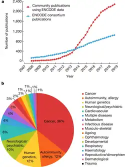 a. Trending graph of publications from the community and from ENCODE consortium from 2007 - 2019. b. Types of publications using ENCODE data according to the field of research.[13]