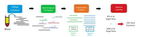 With deep WGS data of cfDNA from a carcinoma of unknown primary patient with very low ctDNA concentration quantified, they trained a machine learning model using bootstrapping. The results of RNA-sequencing on PBMC runs for the 5 different patients are recorded and the average of 3 of these individuals' expression levels is used as a reference for gene expression. The genes are clustered into 10 clusters based on reference gene expression to increase the resolution at the core promoters. Then, genes used as a background value for PFE calculation are removed. Next, all the fragments in extended TSS regions, a region that has the center as TSS regions' center and the length of 2000 base pairs, are pooled. The PFE and NDR scores are calculated for the fragments pooled. Further normalization of these scores is done based on their 95th percentile.[1]
