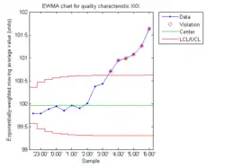 In statistical quality control, an EWMA chart (or exponentially weighted moving average chart) is a type of control chart used to monitor either variables or attributes-type data using the monitored business or industrial process's entire history of output.[1] While other control charts treat rational subgroups of samples individually, the EWMA chart tracks the exponentially-weighted moving average of all prior sample means. EWMA weights samples in geometrically decreasing order so that the most recent samples are weighted most highly while the most distant samples contribute very little.[2]: 406