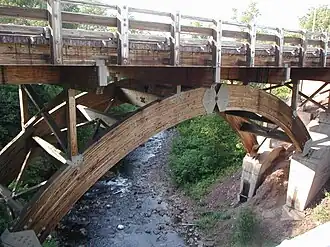 The bridge is primarily constructed of wood joined together with steel connectors. It is supported by two adjacent arches: one spans 74 feet (23 m) and the other 79 feet (24 m). Each arch is constructed from two curved sections joined together by a crown hinge. The road deck is made of wood and covered by an asphalt road surface.[2]