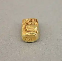 Most gold coins of 9th and early 10th century Java are stamped with the character ta in nagari script on one side, an abbreviation of tahil. The same character remained on coins until the Kediri period in the 12th-century.[1] Gold coins were usually made in the shape of cubes, carefully crafted and very uniform in size and gold content.