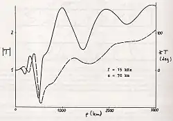- ^ The transmitter is a vertical electric Hertzian dipole radiating at 15 kHz. The virtual reflection height of the Earth-ionosphere waveguide is at 70 km, corresponding to day time conditions at mid-latitudes. The amplitude minimum near ρ = 500 is the last interference minimum between ground wave and first sky wave (ray theory). It is also the first interference minimum between first and second mode (mode theory)