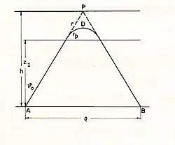 At shorter distances, only the first hop sky wave is of importance. The D-layer can be simulated by a magnetic wall () with a fixed boundary at a virtual height h, which means a phase jump of 180° at the reflection point.[2][5] In reality, the electron density of the D-layer increases with altitude, and the wave is bounded as shown in Figure 2.