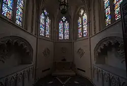 Following the deaths of Richard Beatty and Jennie King Mellon in 1942, the Church Session voted to construct to them a memorial which became Trinity Chapel. The entrance to the chapel is half-way down the east aisle and marked, above the doorway, with a carved shield of the Trinity. The doors are Siamese teak. The interior carvings are inspired by Peter Paul Rubens and the windows by Wilbur H. Burnham. The chapel, designed as well by Cram, was erected at a cost of $120,000 and dedicated January 15, 1944.[3]