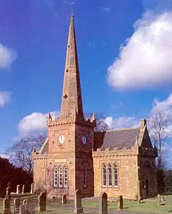 A church dedicated to Saint Michael was first consecrated in 1244, and several church buildings have been used since then. Gilbert Burnet, theologian and Bishop of Salisbury, started his ministry in Saltoun in 1665. The present building dates back to 1805, and is built in the shape of a cross with a Gothic-style tower and steeple.[5]