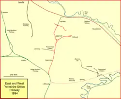 The result was the East and West Yorkshire Union Railways Act 1883 (46 & 47 Vict. c. clxvi) on 2 August 1883 which authorised for the East and West Yorkshire Union Railway. The hoped-for running powers over the Midland Railway and the Great Northern Railway were refused. The main line from Drax was an ambitious project of about 30 miles of railway across difficult terrain.[1][6][4] The E&WYUR soon found that raising the considerable capital sum for its main line was impossible, and in 1886 it got an abandonment act, the East and West Yorkshire Union Railways Act 1886 (49 & 50 Vict. c. lxxxi). The intended line to Drax was to be abandoned, but short branch lines to Lofthouse (near Ardsley) on the GNR and Woodlesford on the Midland Railway were added (or modified), so that the proposed network was about nine miles in extent including siding complexes. Running powers from Lofthouse to Leeds Central over the GNR were requested—passenger operation was still contemplated on the abbreviated system—but these were refused.[4][1][6][5]