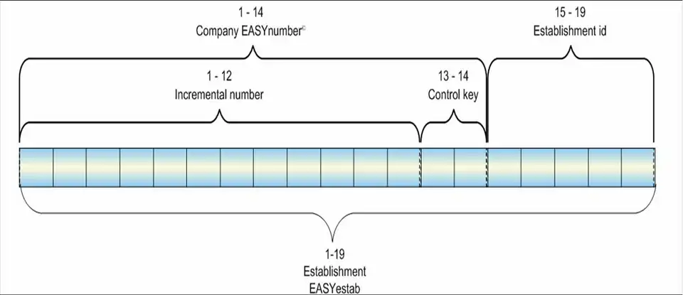 - the first 14 digits make the Company EasyNumber: 12 incremental digits + 2 control key digits