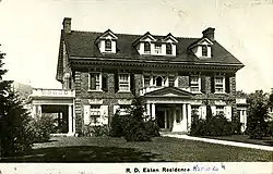The house was built in 1914 for R. D. Eaton to house his family, one of the most prominent families in Central New York. The 2+1⁄2-story, tan brick residence with a green ceramic tile, side-gabled roof resting on a cut stone foundations completed in the Colonial Revival style. The main block is rectangular, five bays wide and two bays deep. The main entrance is set within a prominent one bay wood portico with gabled roof supported by paired, fluted classical columns.[3]