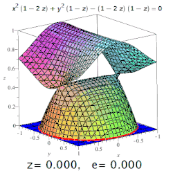The eccentricity of a three-dimensional quadric is the eccentricity of a designated section of it. For example, on a triaxial ellipsoid, the meridional eccentricity is that of the ellipse formed by a section containing both the longest and the shortest axes (one of which will be the polar axis), and the equatorial eccentricity is the eccentricity of the ellipse formed by a section through the centre, perpendicular to the polar axis (i.e. in the equatorial plane). But: conic sections may occur on surfaces of higher order, too (see image).