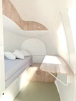 Weighing 2,000 kilograms (4,400 lb)[1] and measuring 4.7 meters (15 ft) in length by 2.2 meters (7.2 ft) in width[4] by 2.5 meters (8.2 ft) in height,[2] the 8.2-square-metre (88 sq ft)[5][6] Ecocapsule is designed to accommodate two occupants.[4] In addition to providing sleeping quarters for two with a folding bed, it also includes a kitchenette, a shower, a fold-out table, working windows, and even storage space.[1][2][4] The Ecocapsule's interior, described by Devin Coldewey as "futuristic but warm," is bathed in natural light and predominantly white in color with blond wood accents.[7]