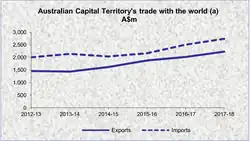In 2017-18 total exports stood at A$2,230 million, while imports reached A$2,738 million, with a negative balance of trade of A$508 million. Services account for almost all exports (>99%) and imports (>90%) in the ACT. Since 2012-13, average annual goods and services exports growth has been 9.9%.[7]