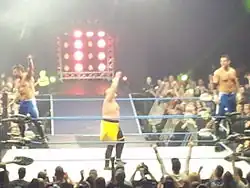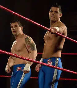 Later that year, in December, Edwards began teaming with fellow Sweet and Sour, Inc member, Davey Richards, as The American Wolves.[7] Their first match as a team was on December 26, at All Star Extravaganza IV, where they lost to The Briscoe Brothers (Jay and Mark) in a three-way elimination tag team match, which also involved Claudio Castagnoli and Nigel McGuinness.[44] The following night at Final Battle 2008, the American Wolves, along with Go Shiozaki, lost to Brent Albright, Roderick Strong, and Erick Stevens in a "New York City Street Fight". Later that night, they attacked and injured Mark Briscoe.[45] As 2009 began, they began challenging for the ROH World Tag Team Championship, losing to the champions Kevin Steen and El Generico on numerous occasions.[46][47] They eventually won the Championship on April 10, at a Ring of Honor Wrestling taping, in a "Tables are Legal" match.[48] Edwards and Richards went on to successfully defend the Championship against teams made up of ROH's top wrestlers including Tyler Black and Bryan Danielson, and against former champions Kevin Steen and El Generico at Manhattan Mayhem III in a submission match.