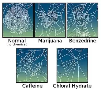 In 1948, Swiss pharmacologist Peter N. Witt started his research on the effect of drugs on spiders. The initial motivation for the study was a request from his colleague, zoologist H. M. Peters, to shift the time when garden spiders build their webs from between 2:00 a.m. and 5:00 a.m., which was decidedly inconvenient for Peters, to earlier hours.[8] Witt tested spiders with a range of psychoactive drugs, including amphetamine, mescaline, strychnine, LSD, and caffeine, and found that the drugs affect the size and shape of the web rather than the time when it is built. At small doses of caffeine (10 μg/spider), the webs were smaller; the radii were uneven, but the regularity of the circles was unaffected. At higher doses (100 μg/spider), the shape changed more, and the web design became irregular. All the drugs tested reduced web regularity except for small doses (0.1–0.3 μg) of LSD, which increased web regularity.[7]